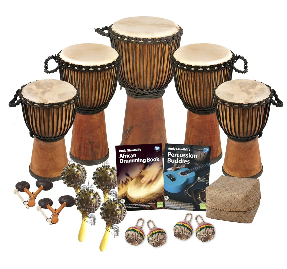 You get 5 Pro Wide Top djembes and 10 percussion instruments. You also get West African Drumming Book 1 and Percussion Buddies. This gives you instruments and a clear teaching route.