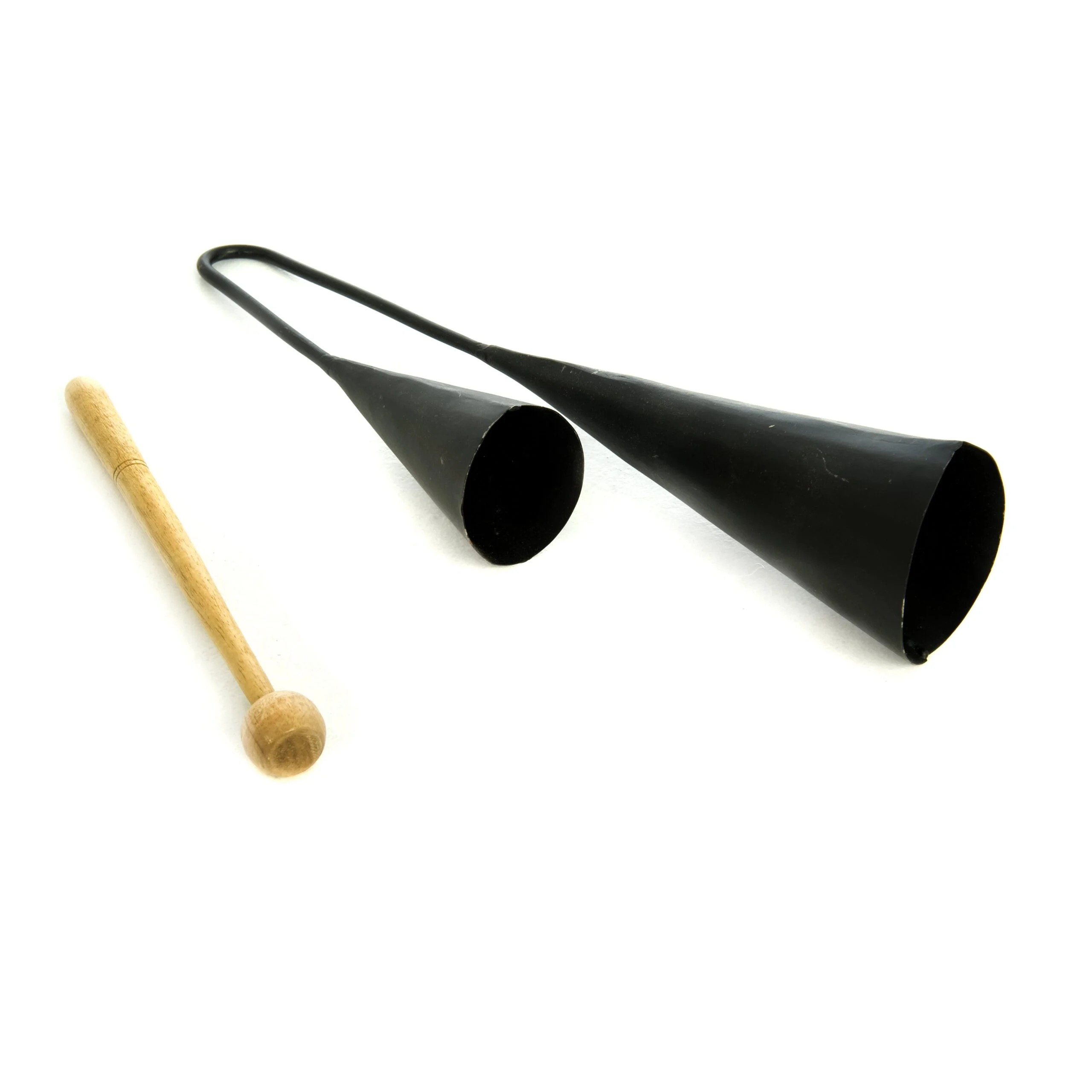 Small metal agogo bells with two differently sized bells tuned about a fourth apart. Played with a wooden beater for bright, cutting rhythms in Samba and African ensembles – lightweight and higher-pitched for younger hands.
