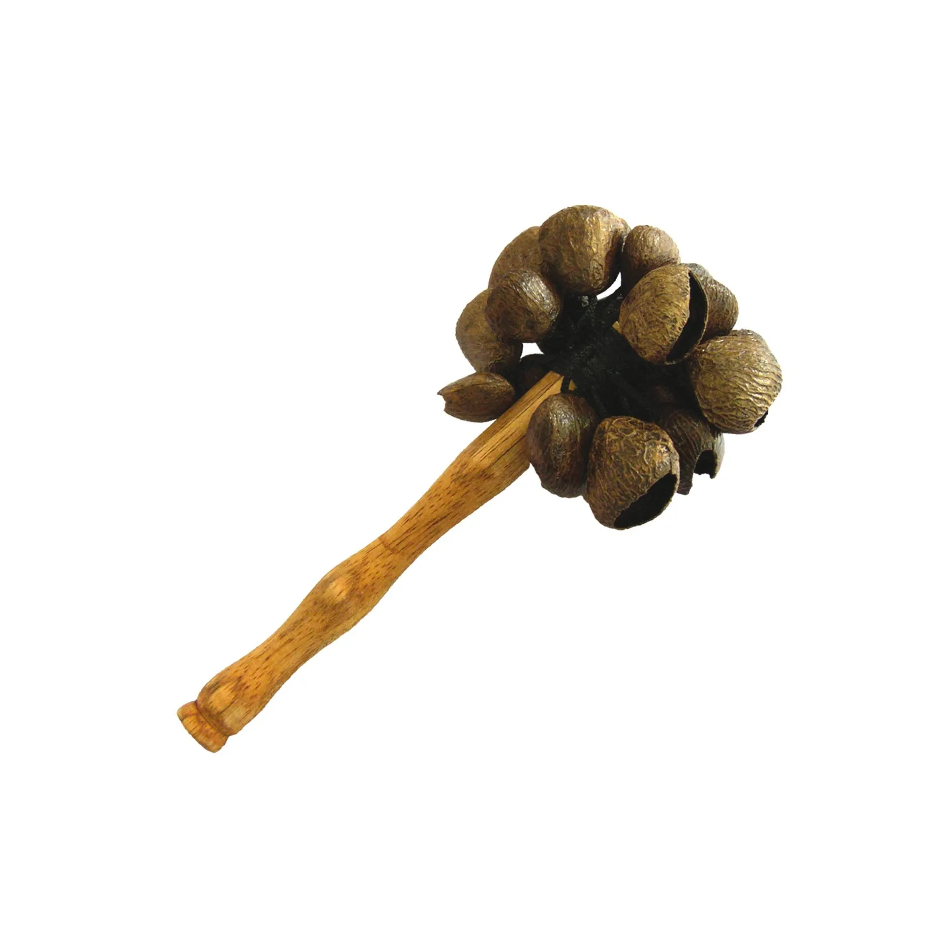 This is an instrument comprised of natural materials with a bamboo handle and empty fruit husks.