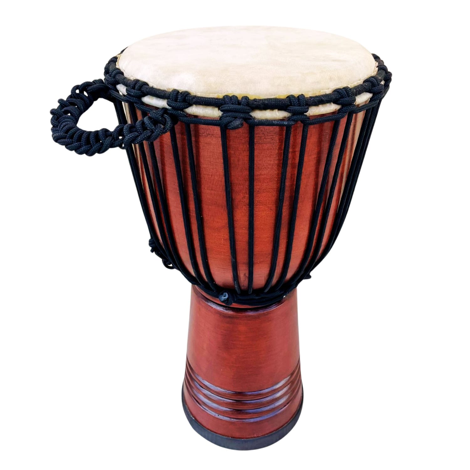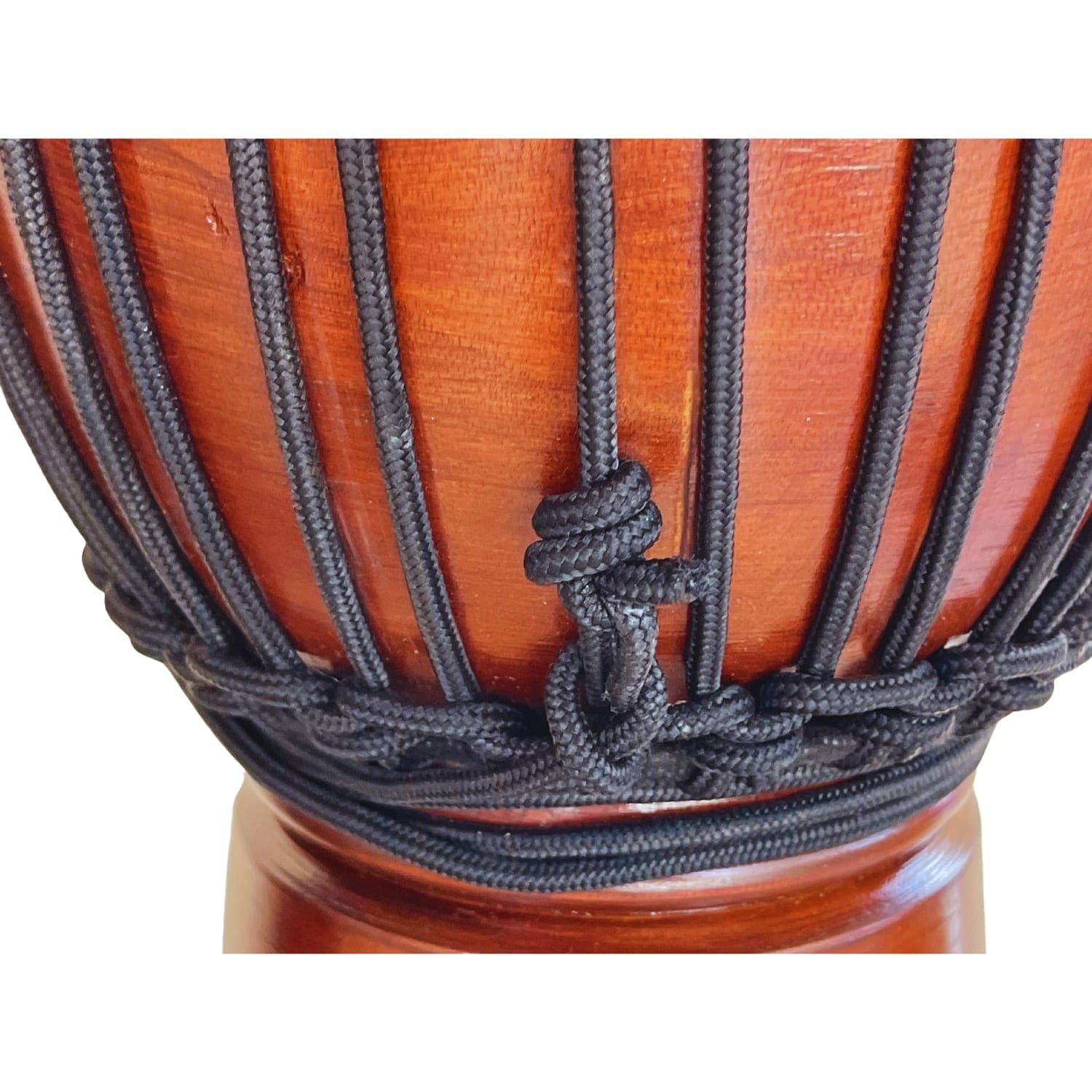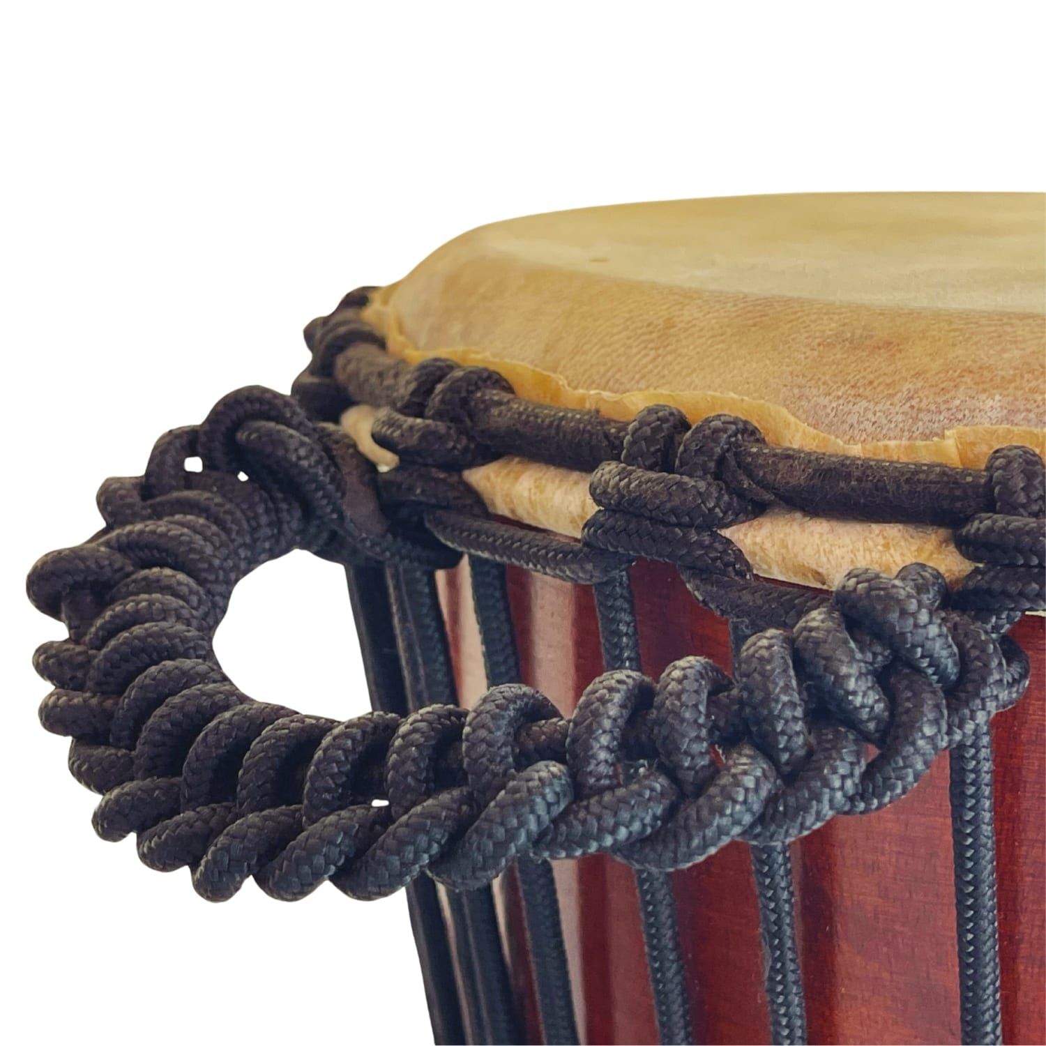 Taking care: Keep your djembe in a dry place away from direct sunlight or heat sources. If it gets wet, allow it to dry slowly. Always avoid sharp objects near the drum skin to prevent damage.